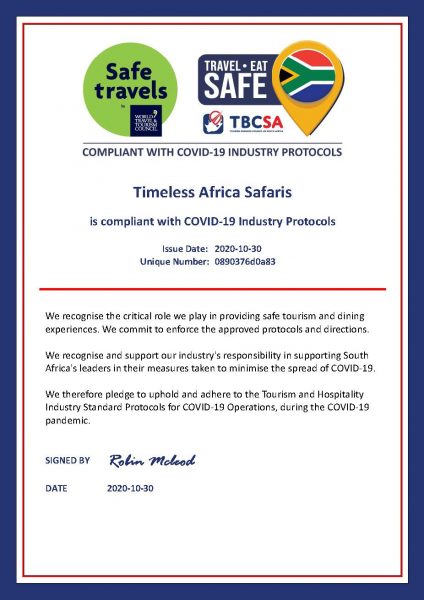 Timeless Africa Safaris is recognised by the Tourism Business Council of South Africa for the critical role we play in providing safe tourism and dining experiences and committing to enforce the approved protocols and directions.