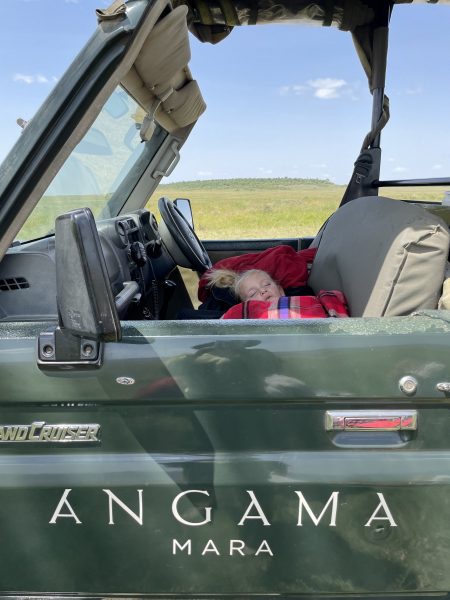 Leah’s trip was permeated by a fascination with birds. Wilson, our excellent game ranger, taught her all about birds, their markings, habits and helped her identify the feathers she found.The safari napper.The safari napper had a few of her own moments in the limelight.