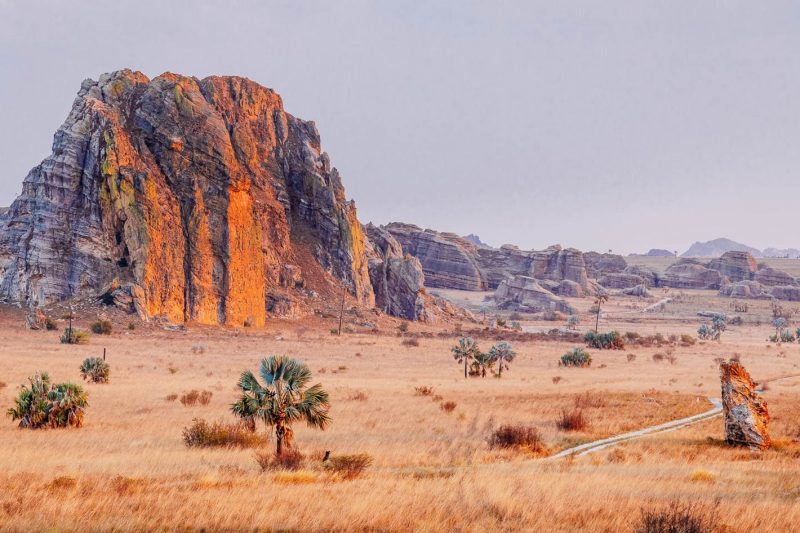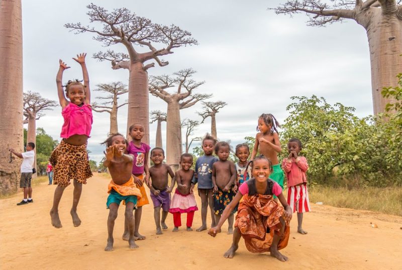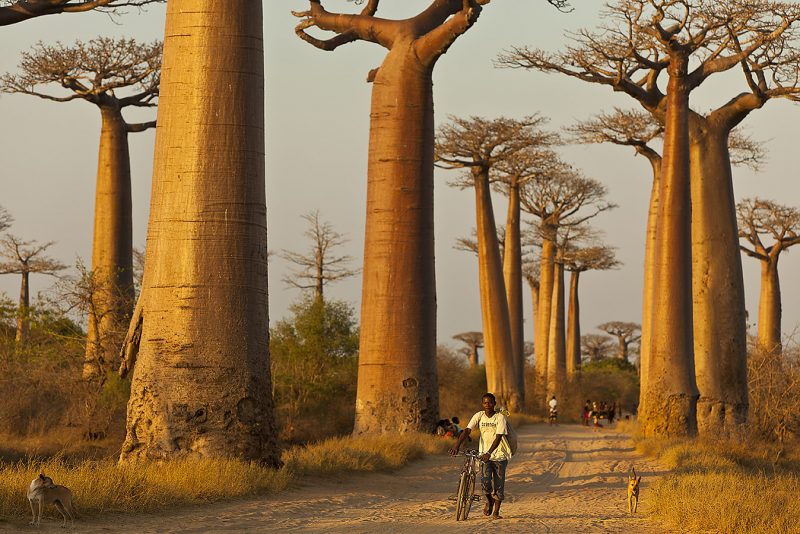 A dusty road lined with ancient baobabs that rise almost a hundred feet into the sky.