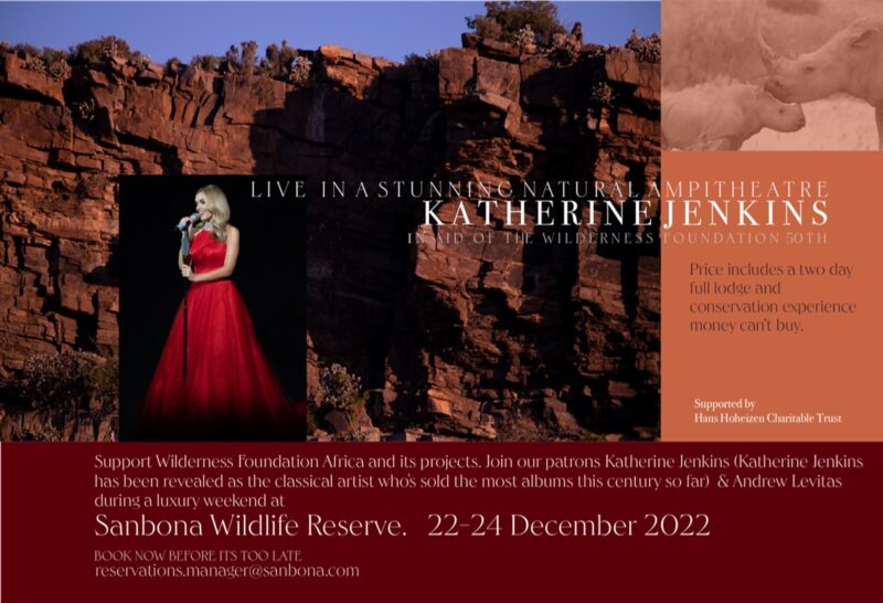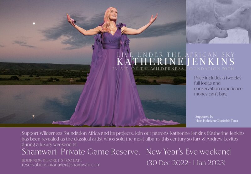 Welsh Superstar Mezzo Soprano Katherine Jenkins and her husband (Andrew Levitas) are both global Patrons of our organisation and support our work, in keeping with the spirit of what Wilderness Foundation Africa stands for, we are holding two unique three-day conservation experiences on the private game reserves in South Africa of Sanbona (Western Cape) 22 to the 24 December and Shamwari (Eastern Cape) 30 December to the 1 January, which includes a special performance with Katherine Jenkins singing with her extraordinary voice live under the African sky .
