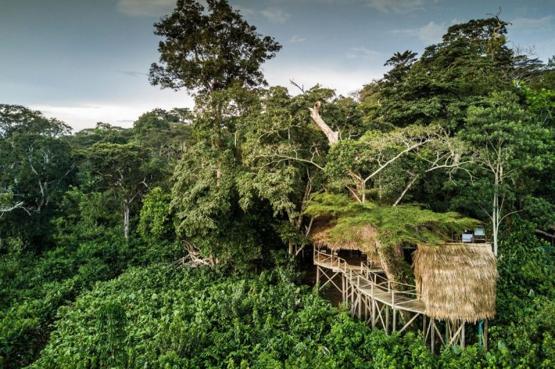 The camp is situated within the overlapping home ranges of several groups of western lowland gorillas, three of which are habituated. A team of permanent researchers and trackers from nearby communities work with the gorilla families on a daily basis. Guests of Odzala are led on expeditions by established guides and trackers into the forest in search of this critically endangered species. Chalets are found on stilts in the dense forest overlooking the Ndezhi Forest and are constructed from natural materials such as locally woven raffia palm panels. Chalets are raised above the ground and boast a 360° wraparound walkway.