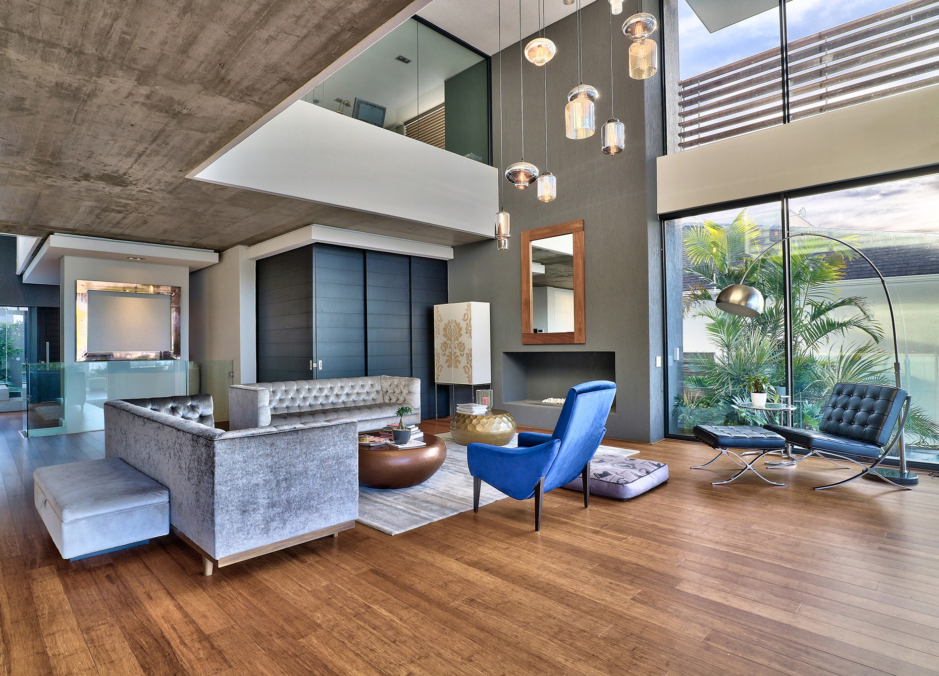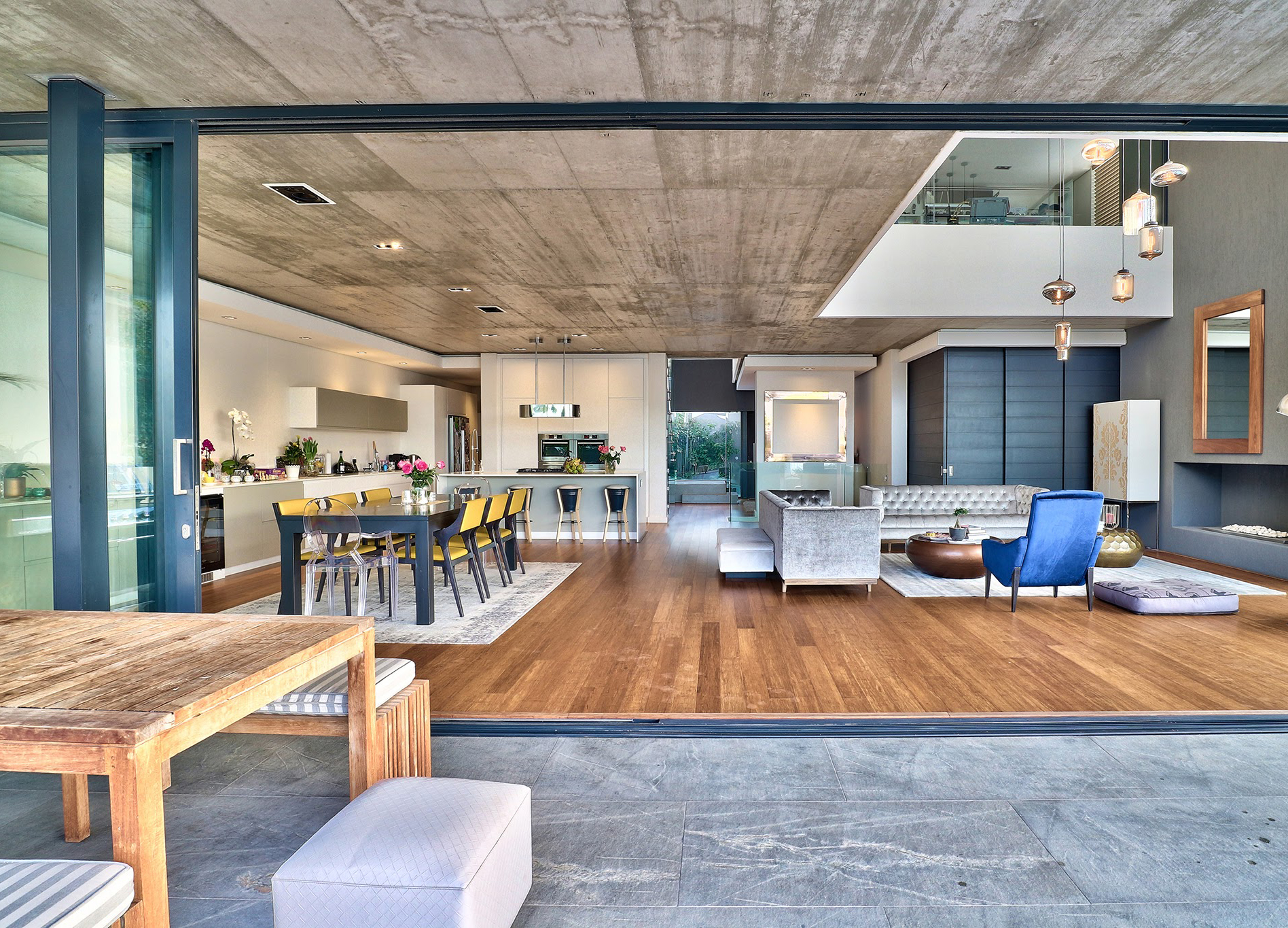 Concrete and chrome have been cleverly contrasted with plush couches and soft rugs, imparting a warm, homely feel. Living areas are completely open-plan with large glass stacking doors opening right up for seamless indoor-outdoor living.